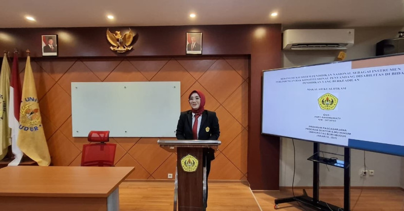 JAKARTA -- Jurnalis Popy Rakhmawaty resmi menuntaskan ujian sidang makalah kualifikasinya di Program Pascasarjana Universitas Borobudur Jakarta. Makalah Popy berjudul “Rekonstruksi Sistem Pendidikan Nasional sebagai Instrumen Perlindungan Hak Konstitusional Penyandang Disabilitas di Bidang Pendidikan yang Berkeadilan.”