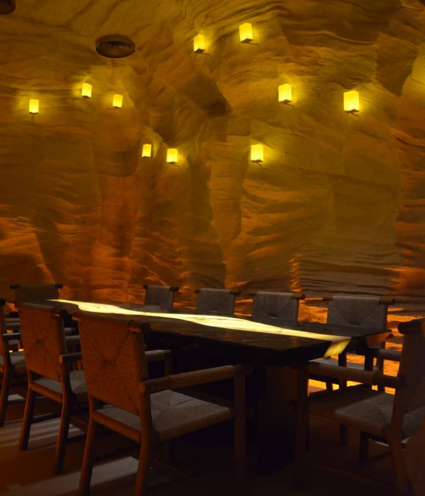 Terinspirasi dari konsep canyon, desain interior GOA SAYA memadukan permainan warna dan tekstur yang mempesona, diperkaya dengan ukiran-ukiran bergaya Timur Tengah. Setiap sudut ruangan, termasuk area toilet, menampilkan karakter berbeda, namun tetap harmonis dalam satu kesatuan atmosfer yang hangat dan elegan.